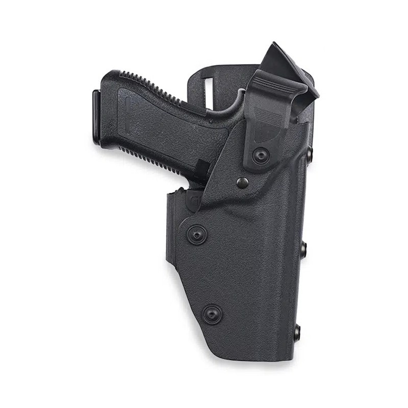 CARACTÉRISTIQUES Double système de rétention de l’arme Rétention passive Rétention mécanique active Rétention réglable par vis Multi-armes Excellente résistance à la déchirure, torsion, chocs et variations climatique Rail de guidage Déflecteur anti-arrachement Compatible ceinturon 50mm Livré avec un passant port médium #9840BL9 COMPATIBLE AVEC : CZ : 75 P-07 Glock : 17 (jusqu’à génération 5) et 22 (jusqu’à génération 4) Heckler & Koch : USP compact HS-Produckt : XDM SIG Sauer : SIG PRO 2022, SIG PRO, P220-P226 Smith & Wesson : MP9